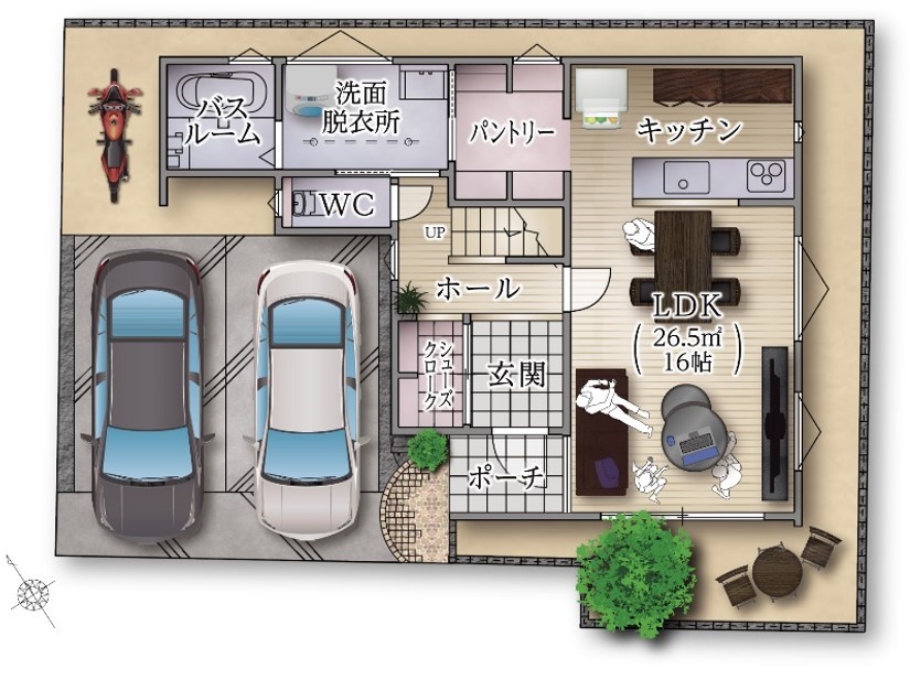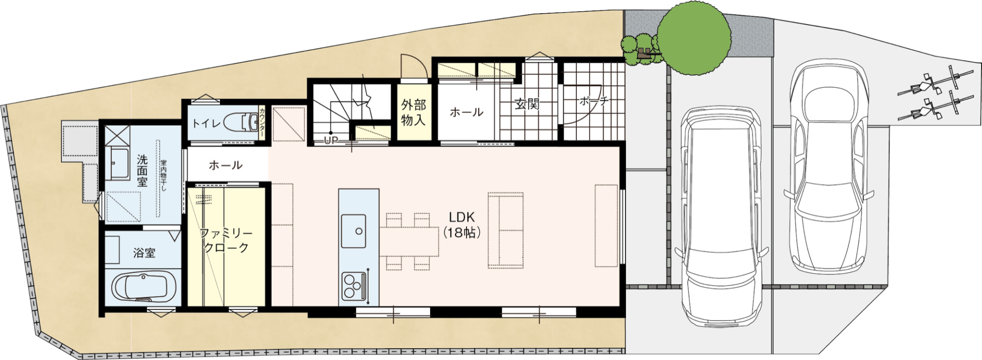 こちらの事例では、洗面所兼ランドリールームとキッチンの間にファミリークローゼットをレイアウト。