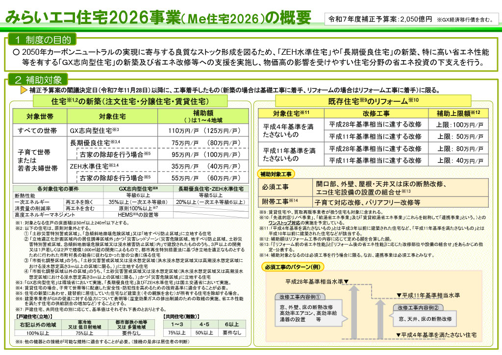 今回は新築・リフォームを対象としている「みらいエコ住宅2026事業 」に絞って詳細を見ていきましょう。