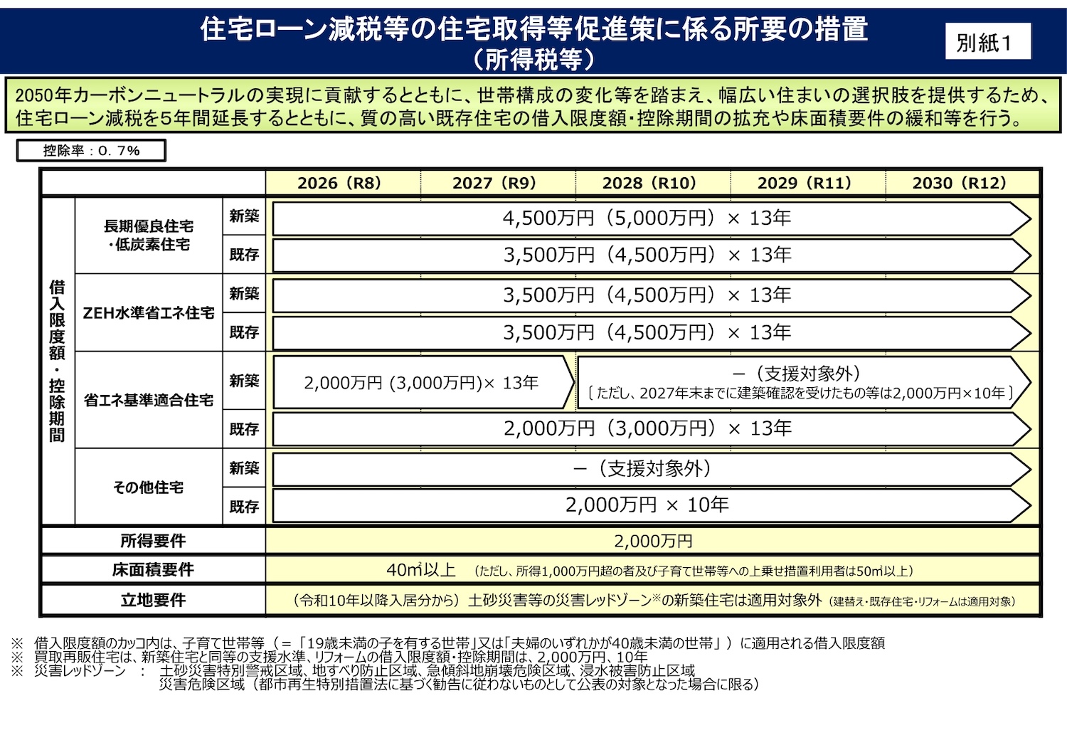 〇2028年度以降➡対象外(ただし2027年までに建築確認を受けた省エネ基準適合住宅などについては、借入限度額2,000万円、控除期間10年間となります)
