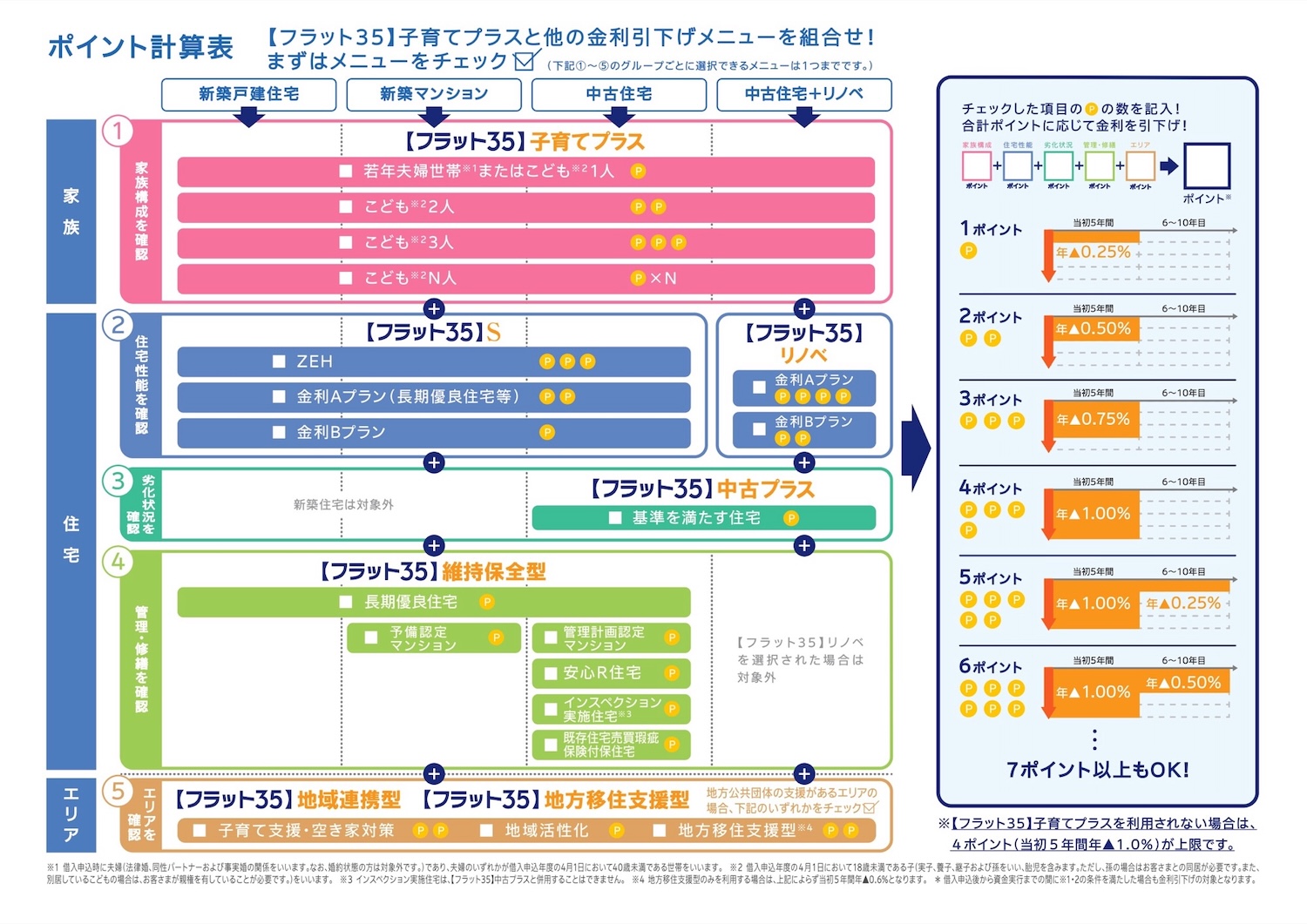 また【フラット35】は、金利引き下げメニューの併用が可能です。子どもの数などに応じてポイントが加算される【フラット35】子育てプラスの他、住宅の性能に応じてポイントが加算される【フラット35】Sや、地方公共団体の支援と連携した【フラット35】地域連携型など、該当する金利引き下げメニューのポイントの合計によって、最終的な引き下げ幅が決定します。