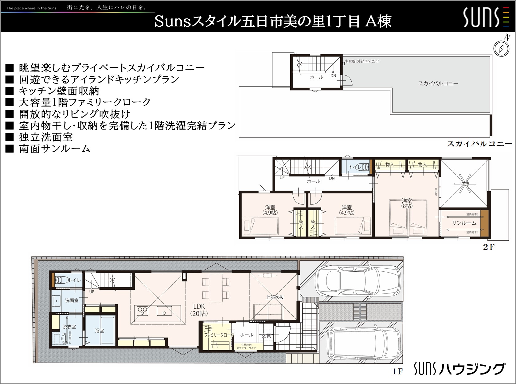フラット35Sに対応 / 地盤調査済 / 駐車2台可(車種による) / LDK20帖以上 / 南東向き / システムキッチン / 全居室収納 / 閑静な住宅地 / 前道3m以上 / シャワー付洗面化粧台 / アイランドキッチン / EV車充電設備 / トイレ2ヶ所 / 浴室1坪以上 / 2階建 / サンルーム / 複層ガラス / 温水洗浄便座 / 節水型トイレ / 通風良好 / ファミリークローク / IHクッキングヒーター / 全居室複層ガラスか樹脂サッシ / 食器洗乾燥機 / オール電化 / 浄水器 / スカイバルコニー(屋上バルコニー)