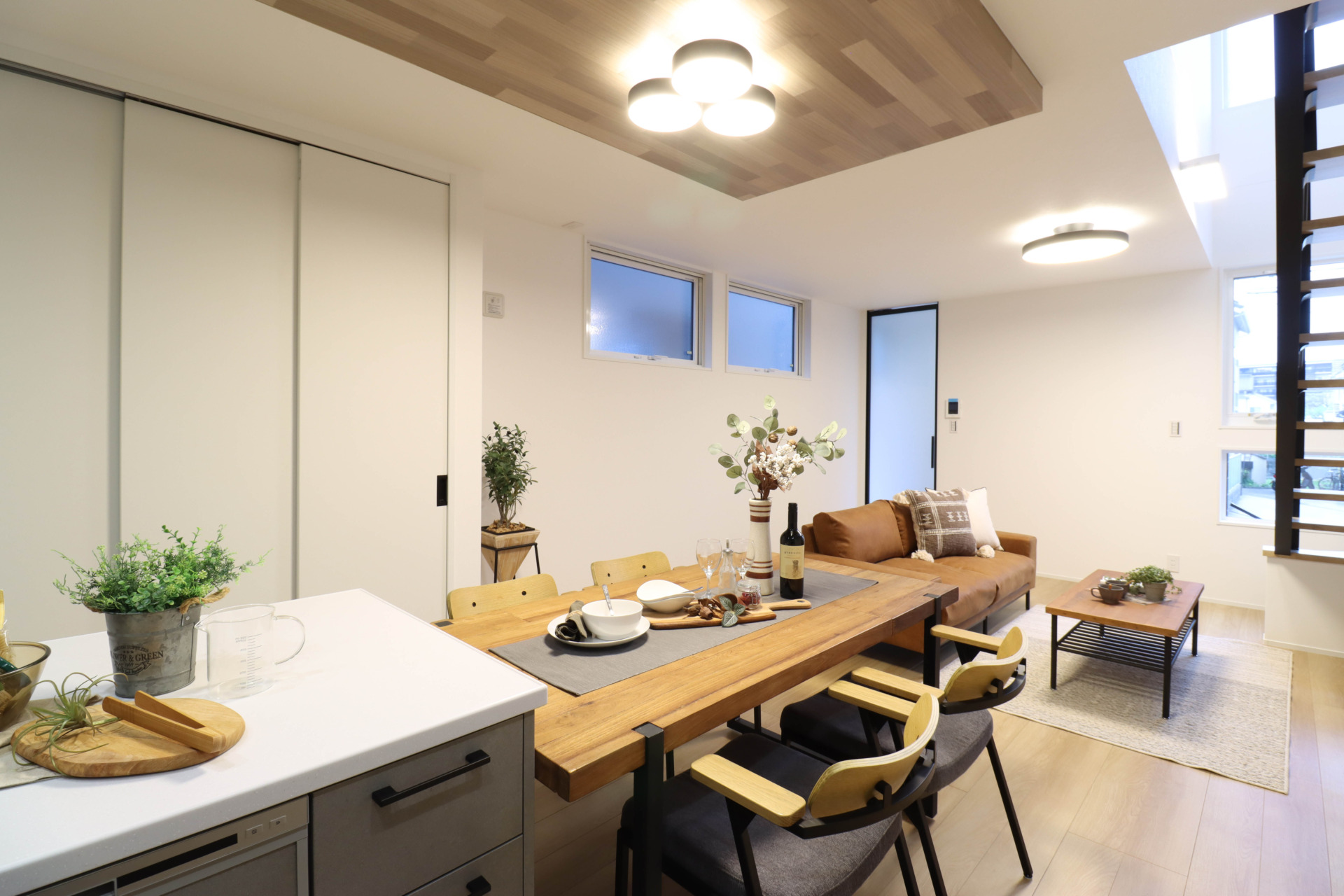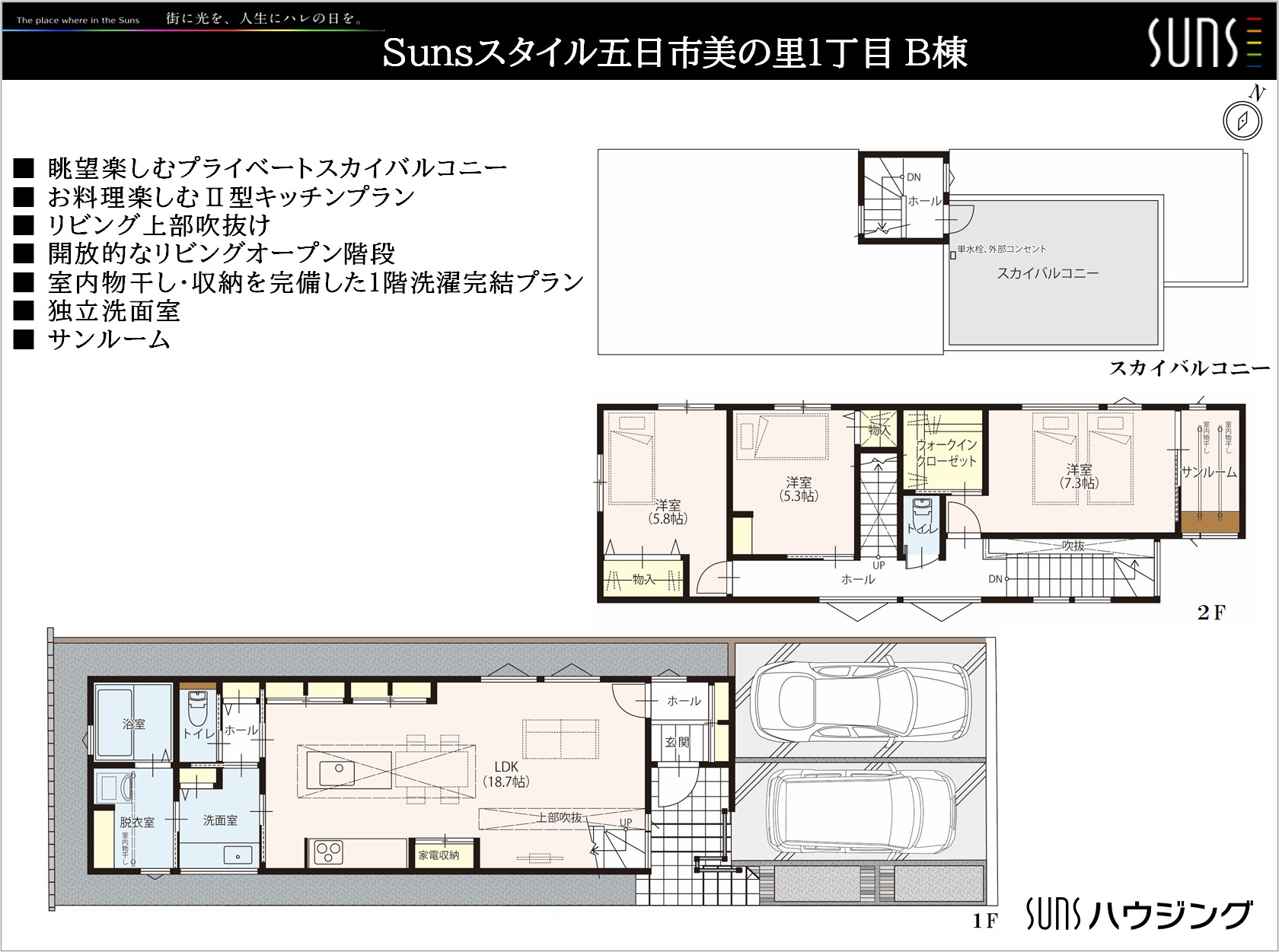 フラット35Sに対応 / 地盤調査済 / 駐車2台可(車種による) / LDK18帖以上 / 南東向き / システムキッチン / 全居室収納 / 閑静な住宅地 / 前道3m以上 / 独立洗面室 / シャワー付洗面化粧台 / Ⅱ型キッチン / EV車充電設備 / トイレ2ヶ所 / 浴室1坪以上 / 2階建 / リビング階段 / サンルーム / 複層ガラス / 温水洗浄便座 / 節水型トイレ / 通風良好 / IHクッキングヒーター / 全居室複層ガラスか複層サッシ / 食器洗乾燥機 / オール電化 / 浄水器 / スカイバルコニー(屋上バルコニー)