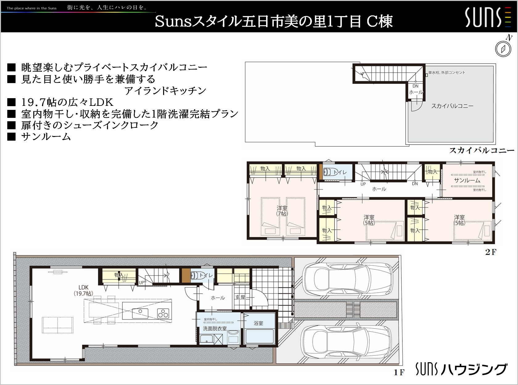 フラット35Sに対応 / 地盤調査済 / 駐車2台可(車種による) / LDK18帖以上 / 南東向き / システムキッチン / 全居室収納 / 閑静な住宅地 / 前道3m以上 / シャワー付洗面化粧台 / アイランドキッチン / 横並びダイニング / EV車充電設備 / トイレ2ヶ所 / 浴室1坪以上 / 2階建 / サンルーム / 複層ガラス / 温水洗浄便座 / 節水型トイレ / 通風良好 / シューズインクローク / IHクッキングヒーター / 全居室複層ガラスか樹脂サッシ / 食器洗乾燥機 / オール電化 / 浄水器 / スカイバルコニー(屋上バルコニー)