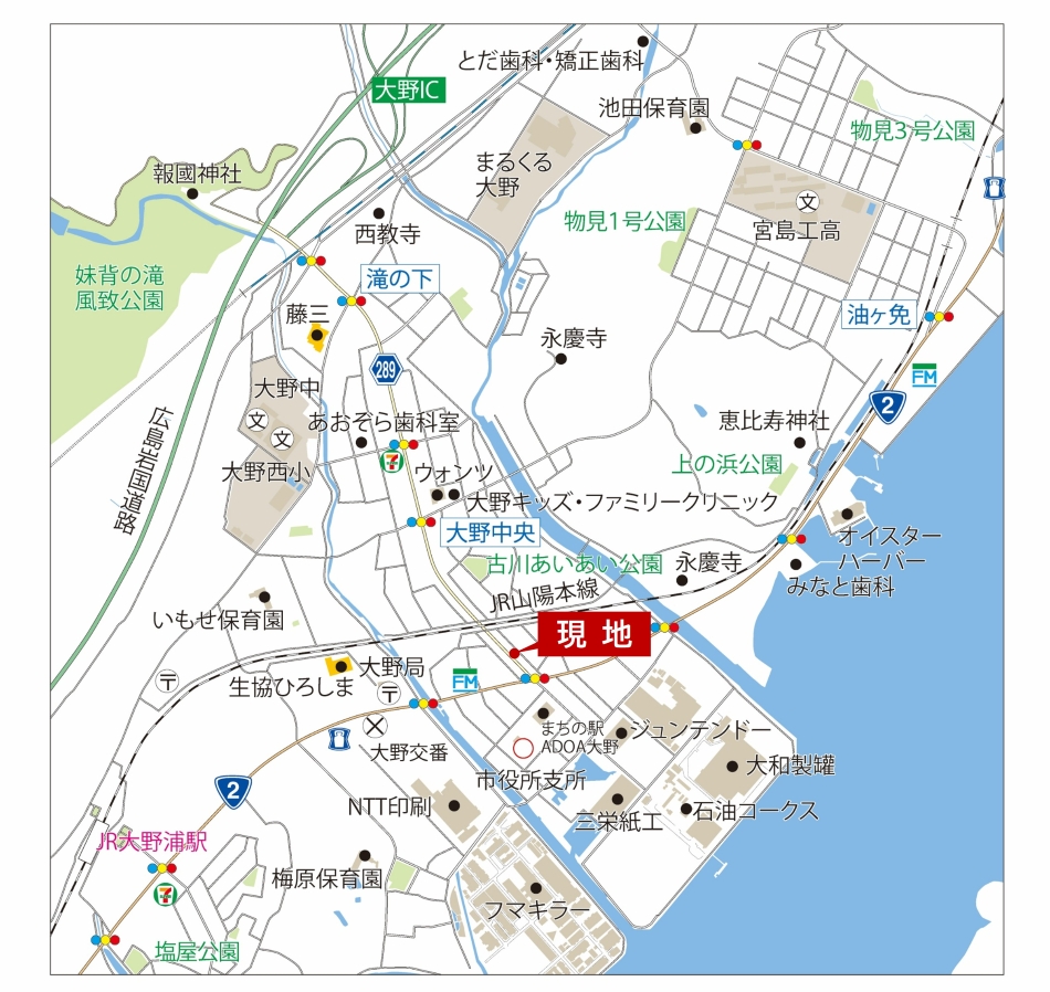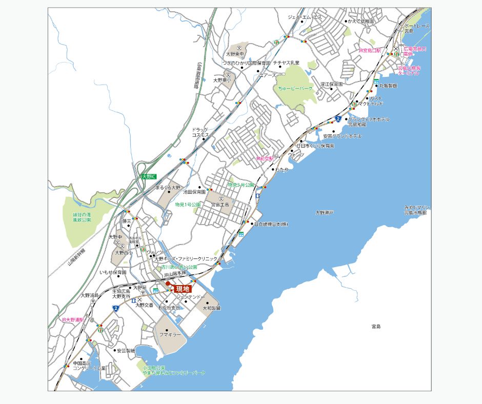 JR「廿日市」駅まで約15分、JR「大竹」駅まで約9分、ミナモアの開業や広電乗り入れで話題のJR「広島」駅まで約35分の好アクセス!
